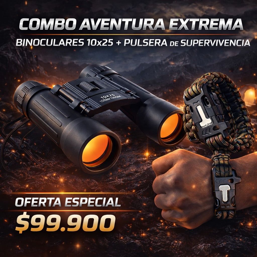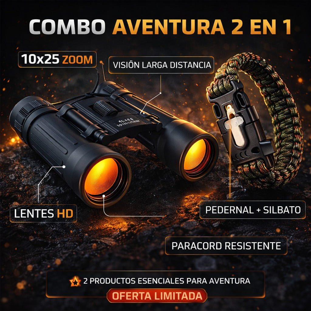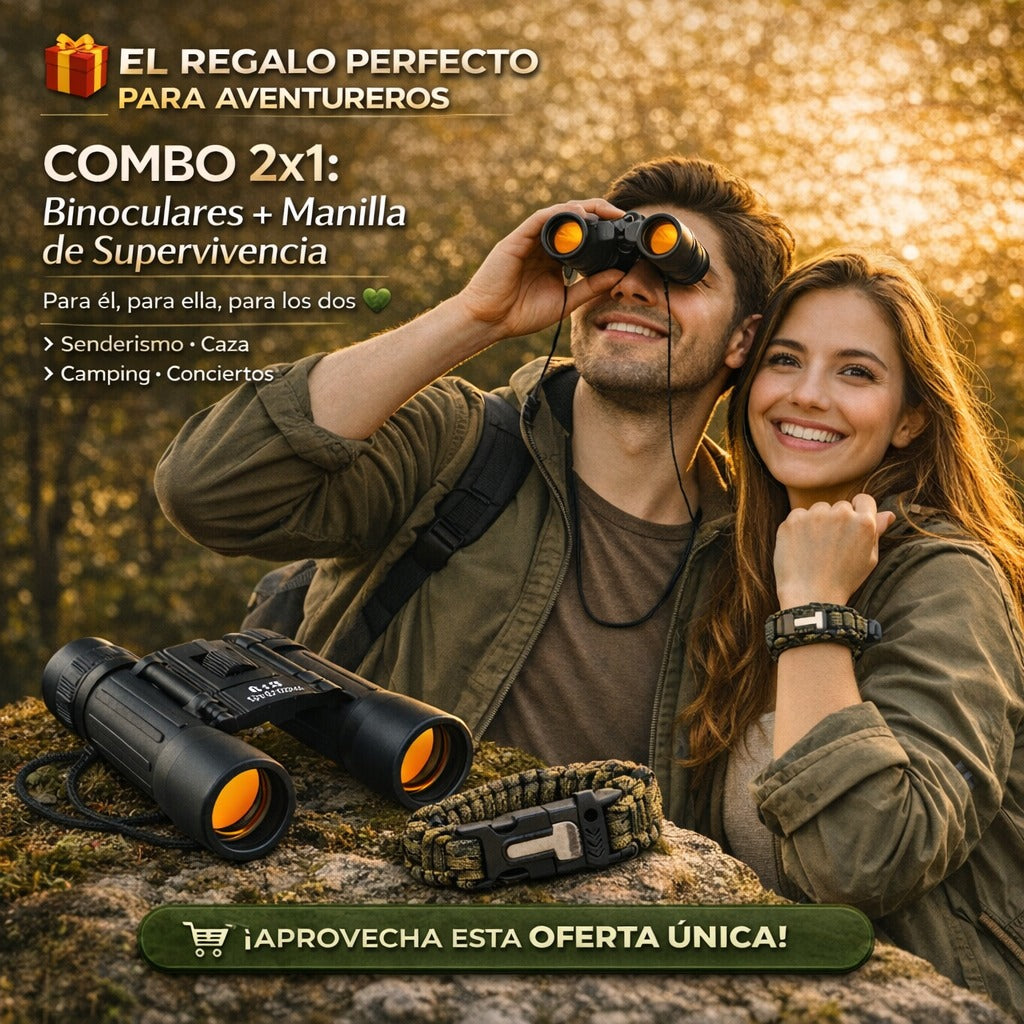 El Combo Aventura 2 en 1 es perfecto para exploradores, campistas y amantes de la naturaleza. Incluye binoculares de largo alcance y pulsera paracord de supervivencia con herramientas esenciales.